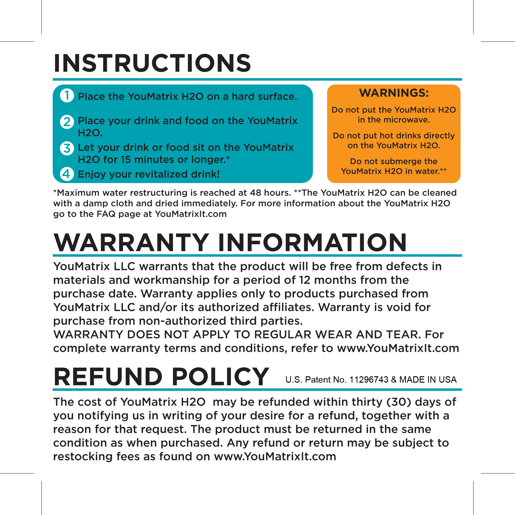 Maximum water restructuring is reached at 48 hours. **The YouMatrix H2O can be cleaned with a damp cloth and dried immediately. For more information about the YouMatrix H2O go to the FAQ page at YouMatrixIt.com