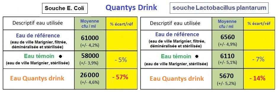 The data analysis shows that the “Quantys drink” device possesses a net inhibiting power on the growth of a strain of microbiotic bacteria “pathogenic”; Escherichia Coli and a significant inhibitory effect on Lactobacillus plantarum (bacterium biogenic ie useful) compared to a control water (city water sterilized).